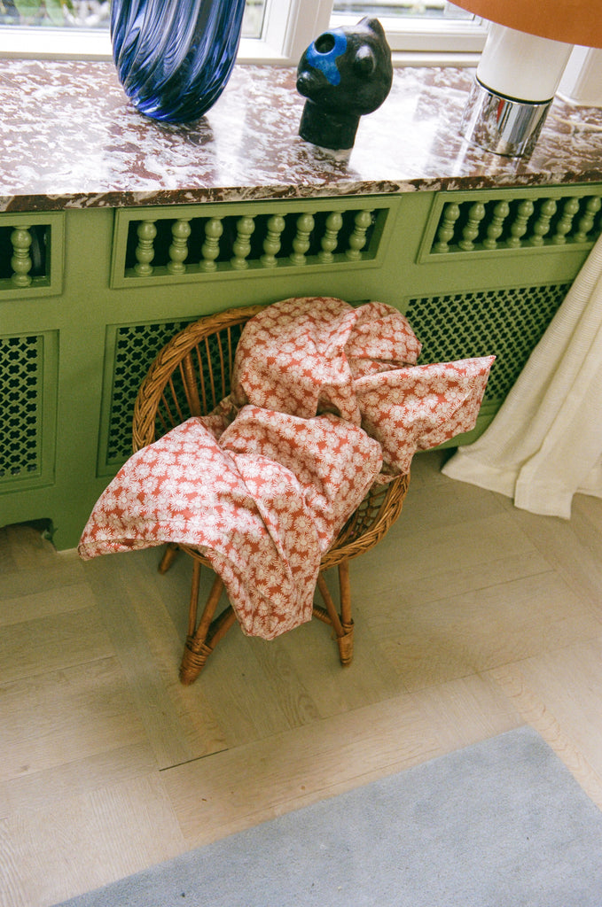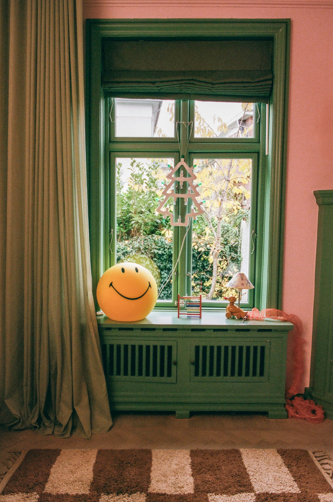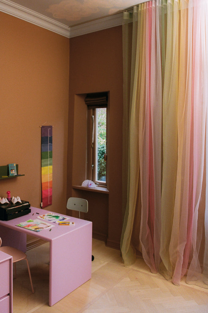 You won’t see much white in there because I find white quite “loud.” Instead, I use colors, wood, and lots of textiles to make the rooms feel soft and grounding. And then a little desk with chairs on both sides, because they love drawing and chatting across each other.