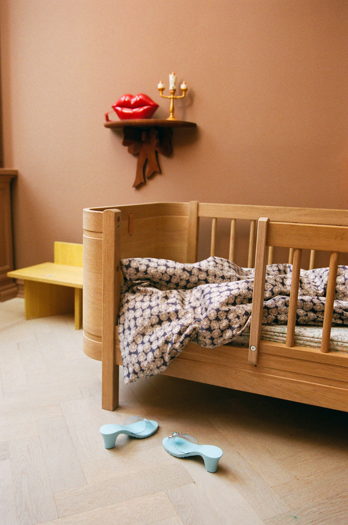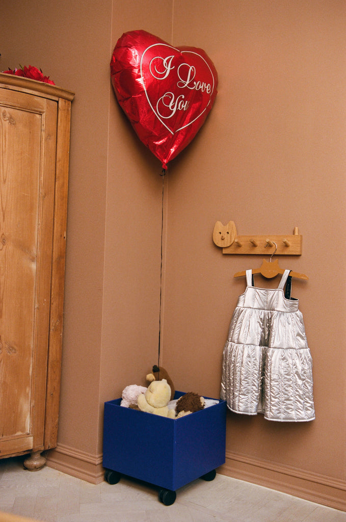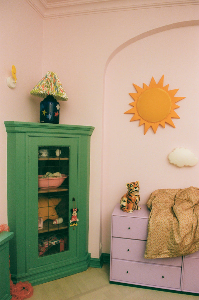 CL The girls recently got each their own room. Leonora chose our old bedroom, the smallest one, because she liked that cozy cave feeling in there. It was already painted brown with a blue ceiling, so we just added small playful details, like clouds on the ceiling and a thrifted cabinet. Every color is a proper match for brown, so moving her old purple drawers and desk just blended in well. Vilhelmine’s room is painted in soft pink and green, with wooden furniture to bring warmth. I always work with contrast. When something feels soft and earthy, I like adding a small bold detail, just enough to make the room feel alive, but still calm, hence you will find a few bold red elements in the room, from the shelf, to a storage box, to my old doll strollers.