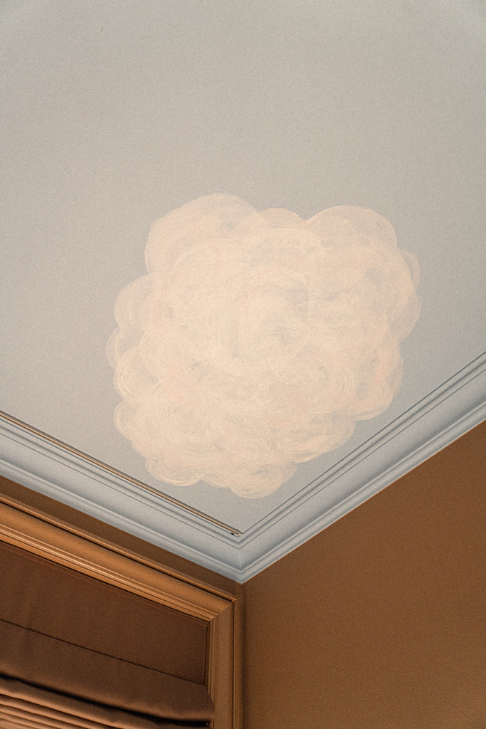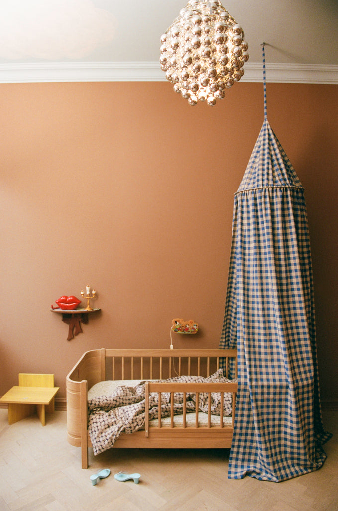 Bed Canopy Blue over Leonora’s bed, with Verner Panton’s Ball Pendant hanging from the ceiling