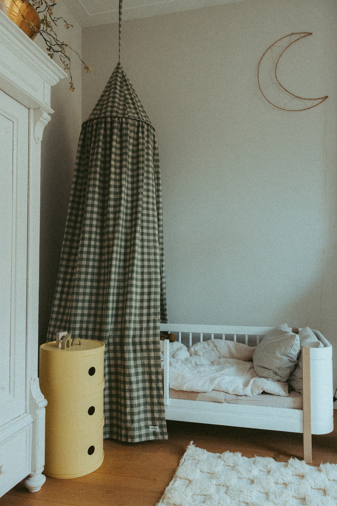 Bed Canopy Green hanging from an old beam in the living room, next to the white Alma steel lamp designed by Wästberg