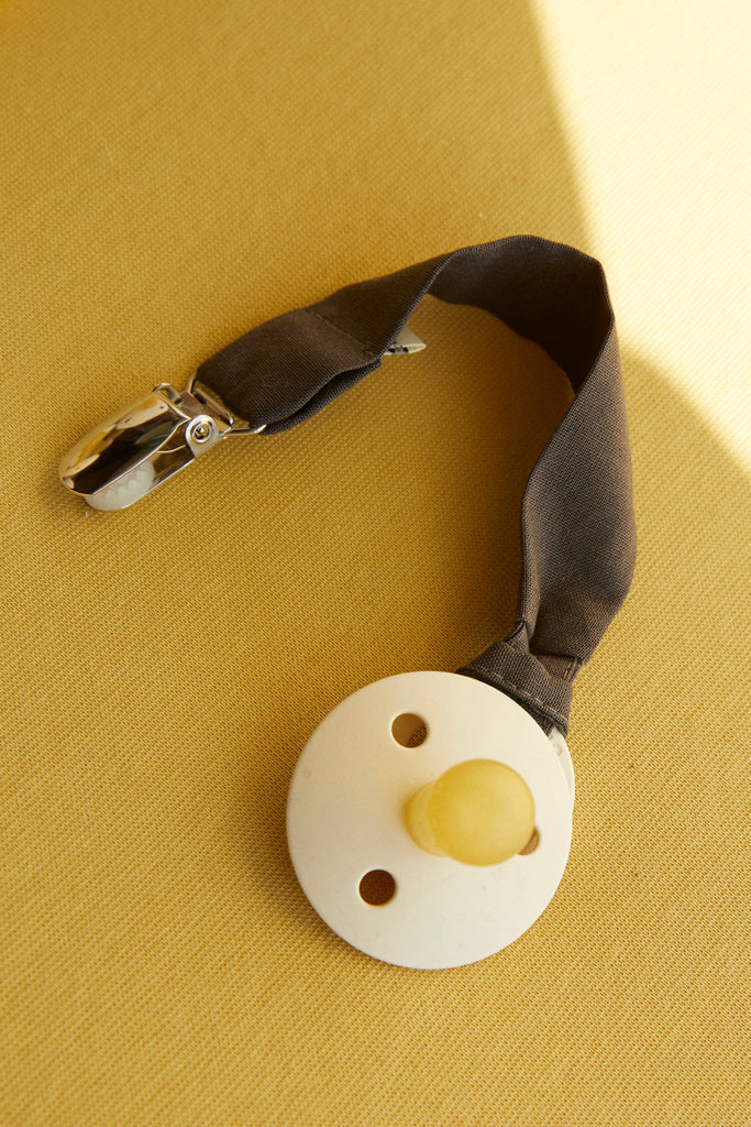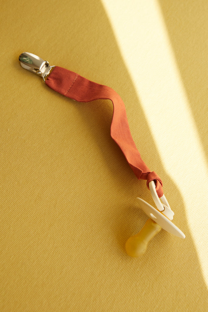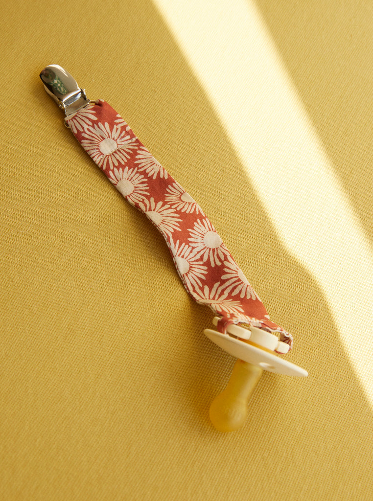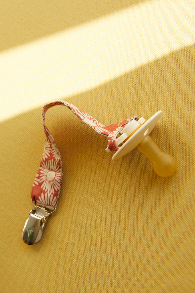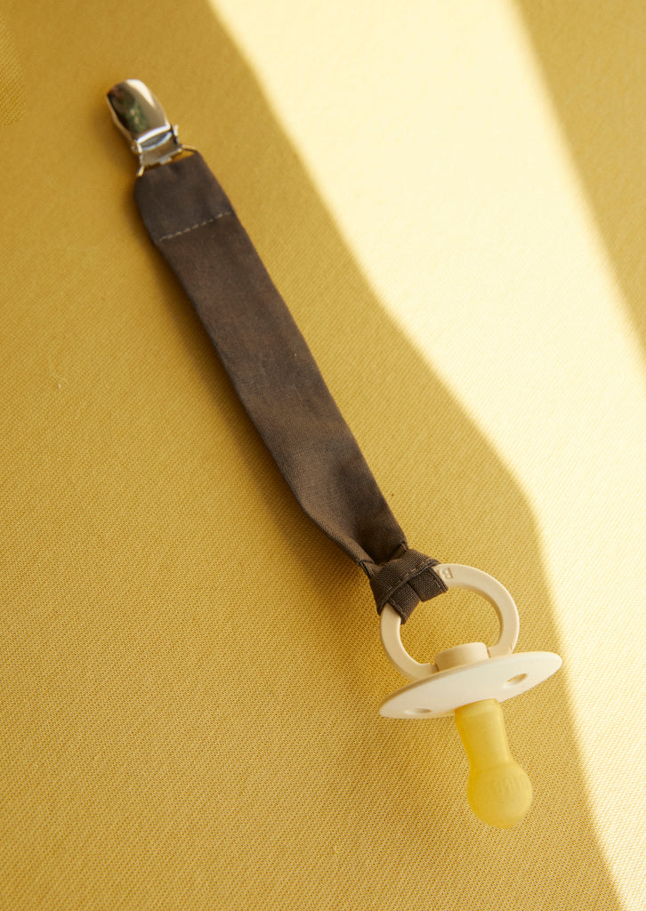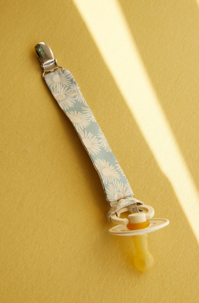Our pacifier clips are machine washable at 40°C. We recommend using a fragrance-free, mild detergent because the pacifier clip often comes in contact with your baby's skin. Hang to dry before using again.